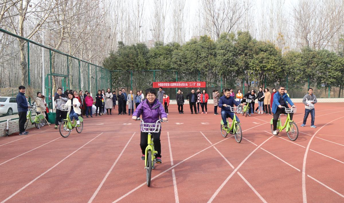 阳春三月,春光明媚,三月八日下午,外国语学院成功举行了第三届教职工趣味运动会暨庆祝“三八节”活动,全体在岗教职工八十余人参与了包括自行车慢骑、倒着说、一圈到底等四个项目的比赛。学院党总支书记兼分工会主席王国志致辞并向全院女教职工表示节日的祝贺。