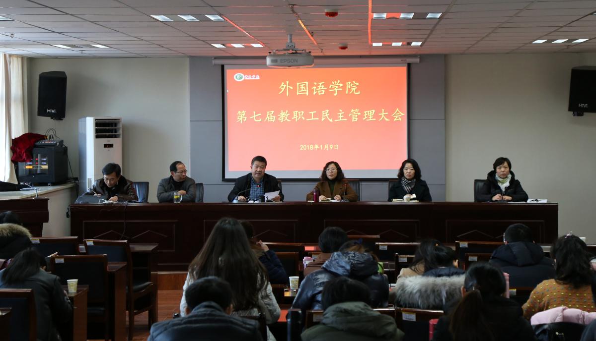 2018年1月9日下午,外国语学院第七届教职工民主管理大会成功召开,学院教职工生80余人参加大会。会议由党总支副书记盛双合主持。