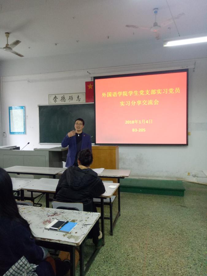 2018年1月4日,外国语学院2014级党员实习分享会在B3-205教室举行,学生党支部书记陈化宇、牛怡晨、李佳琪以及14级全体党员参加交流会。