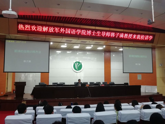 11月08日下午,解放军外国语学院首席教授,博士生导师,郑州大学特聘教授韩子满老师应邀来我院作题为《翻译实践中的问题与自我训练技巧》的专题报告。外国语学院150余名师生参与了此次报告。