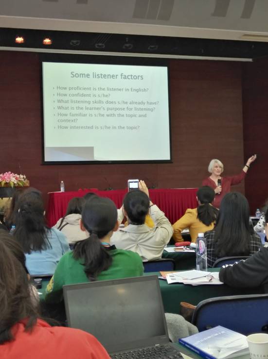 研修班由华中科技大学徐锦芬教授、澳大利亚新南威尔士 Anne Burns教授领衔主讲。徐锦芬教授以英语听说教学研究为题,回顾了英语听说教学研究的成果和存在的不足,并就如何设计英语听说教材以及使用现有教材材料的策略为题,结合自身和学员经验,进行了精彩报告。Anne Burns教授首先以听的过程,技巧和策略引出话题,并对如何促进积极的听为题进行了详细阐述,研修班成员积极参与,畅谈自己在教学实践中的经验和困惑。