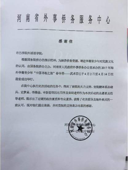 2017年4月2日-4月14日,我院翻译系4名学生孙小兵、史梦真、李腾基、申新茹,在宋琦老师带队指导下,作为2017年海外华裔青少年“中国寻根之旅”春令营——武术营活动的志愿者,全程参与接待工作。活动期间我院师生表现优秀,得到了河南省外事侨务办公室及服务中心领导的认可。