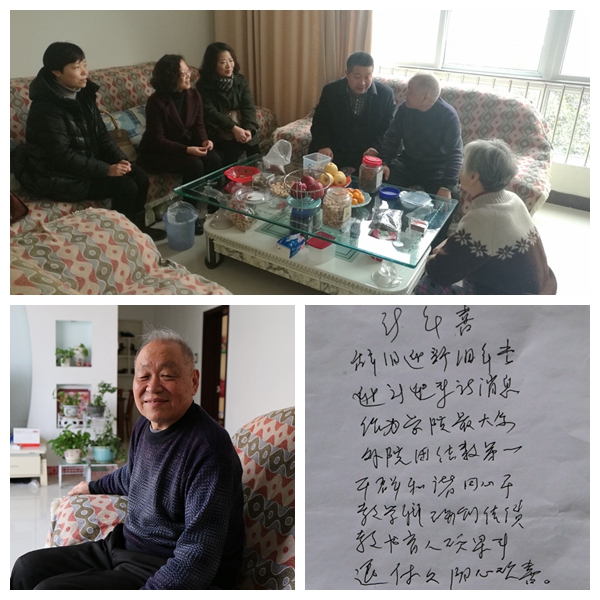 每到一处,院领导都与他们促膝交谈,仔细询问他们的身体和生活情况,倾听他们对学校、学院工作的意见和要求,让他们时刻感受到学校这个“大家庭”的温暖。在退休教师王灿章老师家中,班子成员和老人亲切交谈,嘘寒问暖,详细询问了他的身体状况和生活情况,一行人真切地祝福老人家身体健康,开心安度晚年。王老师对学校、学院近年来的发展也十分关注,得知新外院成立后融合好、发展好,他倍感欣慰,并赋诗一首以表心意,王老师健康的身体和乐观的心态感染了在场的每一个人。慰问博士及困难党员教职工后,王书记一行还专程前往我院连点扶贫单位许昌县袁庄村两户村民家中进行了慰问,并向他们拜早年,祝愿他们身体健康,新春快乐,阖家幸福。(图文:轩亚光)
