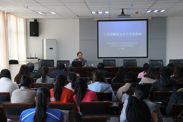 仪式后,王铁桥教授以《开中国崛起与中日关系前瞻》为题,为全场师生作了一场精彩的报告。在中国崛起环节,王教授从中国工业产值、国家创新能力、家电行业、手机电脑行业等方面,详细阐述了中国崛起所表现出来的表层现象与深层现象,并对此进行了比较分析。在对中日关系现状与展望环节,王教授以诙谐幽默的语言、丰富的图文材料,客观、公正地为师生们介绍了中日关系的现状,重点从地理环境、人口体量收到的限制、日本文明先天的缺陷,从中国未来发展方向仍需要向经验丰富的日本进行借鉴等方面分析了中日合作的可能性,同时也列举了中日之间出现的新变化。最后,王教授勉励大家要坚定学习日语的信心,敢于承担缩小中日文化差距的重担,勇于做中日之间交流正能量的积极分子之一,为中日友好交往做出应有的贡献。同学们纷纷表示,此次讲座既开阔了大家的视野,对于激发了同学们的专业学习兴趣,深入了解中日关系有启迪和借鉴意义。