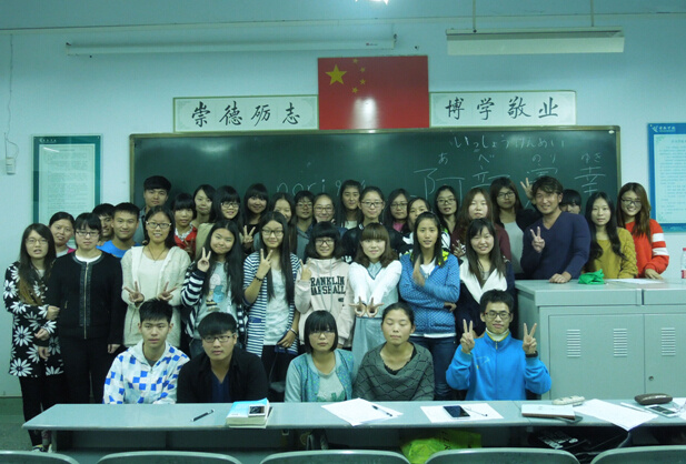 日本友人阿部先生首先进行了自我介绍,为消除与同学们之间的陌生感,阿部先生引导同学们进行了一项愉悦而有意义的活动:填写歌词,学唱日语歌。在欢快的歌声里同学们不仅感受到了日语歌曲的美妙,更增强了他们对日语学习的浓厚兴趣。在活动中,同学们对自己比较感兴趣日本社会、文化、日语学习方面的问题向日本友人进行了提问,阿部先生轻松幽默的语言回答获得了学生们的阵阵掌声。在这种欢快的氛围中,同学们不但解决了日常学习中遇到的问题,而且感受到了日语的独特魅力,增加了同学们学习兴趣。