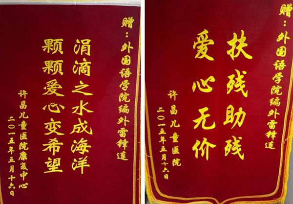 5月28日,许昌市儿童医院康复中心的相关领导,代表全体医护人员,患儿及其家属向许昌学院外国语编外雷锋连赠送了“涓涓之水成海洋,颗颗爱心变希望”和“扶残助残,爱心无价”两面鲜红的锦旗,对外国语学院编外雷锋连的义务志愿活动及无私奉献精神表示肯定与真诚的感谢!