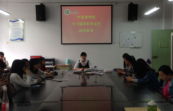 为了进一步提高我院贷款毕业生的还款率和加强国家助学贷款的风险防范。最大限度的降低违约金率,加强对大学生的诚信教育,让更多的贷款毕业生能够诚信还款。5月15日,我院“2015年贷款毕业生毕业教育”大会在蕴韬楼B合六举行,2015届外国语学院贷款毕业生参加了此次大会,会议由陈丹老师主持。