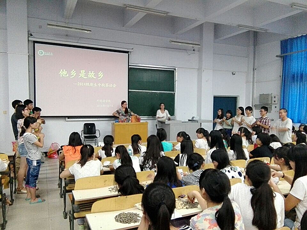 下午3点,我院2014级全体新生在A合四教室举行以“他乡是故乡”为主题的中秋茶话会。