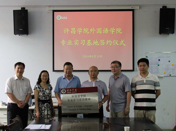 6月19日上午,外国语学院2014年新建专业实习基地签约仪式在学院办公室举行,许昌学院副院长张建军教授应邀出席并讲话。参加仪式的企业代表有许昌瑞宇商贸有限公司经理白光宇、许昌海亚进出口贸易公司经理陈利磊、广州华宇商贸有限公司经理王鹏。外国语学院班子成员及部分教师代表也参加了仪式。签约仪式由外国语学院党总支书记许涛主持。