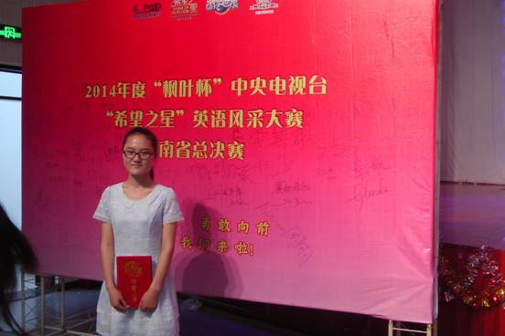 2014年6月6日,在中央电视台“希望之星”英语风采大赛河南省省赛中,我院面对的是来自郑州大学等实力强劲大学的众多对手。在强手如云,劲敌众多的情况下,我院吴露鑫,裴蓉蓉,梁冰等9名选手奋力拼搏,在市决赛中而出,最终吴露鑫同学取得河南省省决赛二等奖的好成绩。