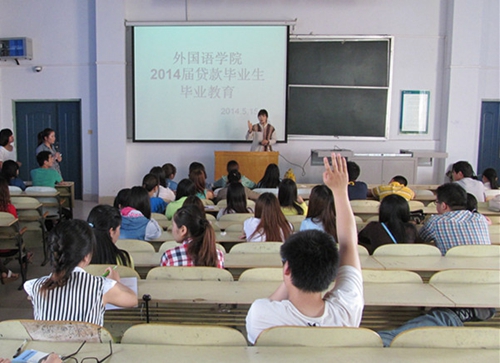 为了进一步提高我院贷款毕业生的还款率和加强国家助学贷款的风险防范。最大限度的降低违约金率,加强对大学生的诚信教育,让更多的贷款毕业生能够诚信还款。5月15日,我院“2014年贷款毕业生毕业教育”大会在蕴韬楼B合六举行,2010届外国语学院贷款毕业生参加了此次大会,会议由陈丹老师主持。