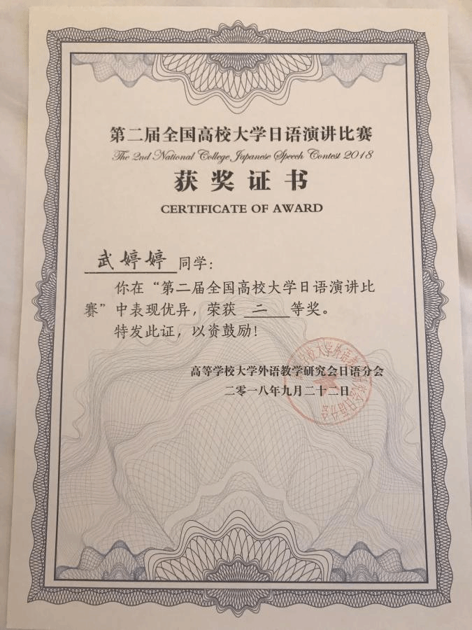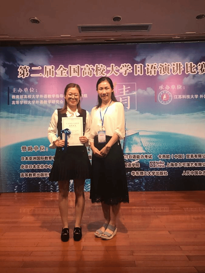 9月22日,第二届全国大学日语演讲比赛在江苏科技大学举行,来自全国高校的33名非日语专业学生参加角逐。外国语学院2015级英语翻译专业武婷婷同学代表许昌学院参赛并获得二等奖,外国语学院日语系教师关铠含获得优秀指导奖。