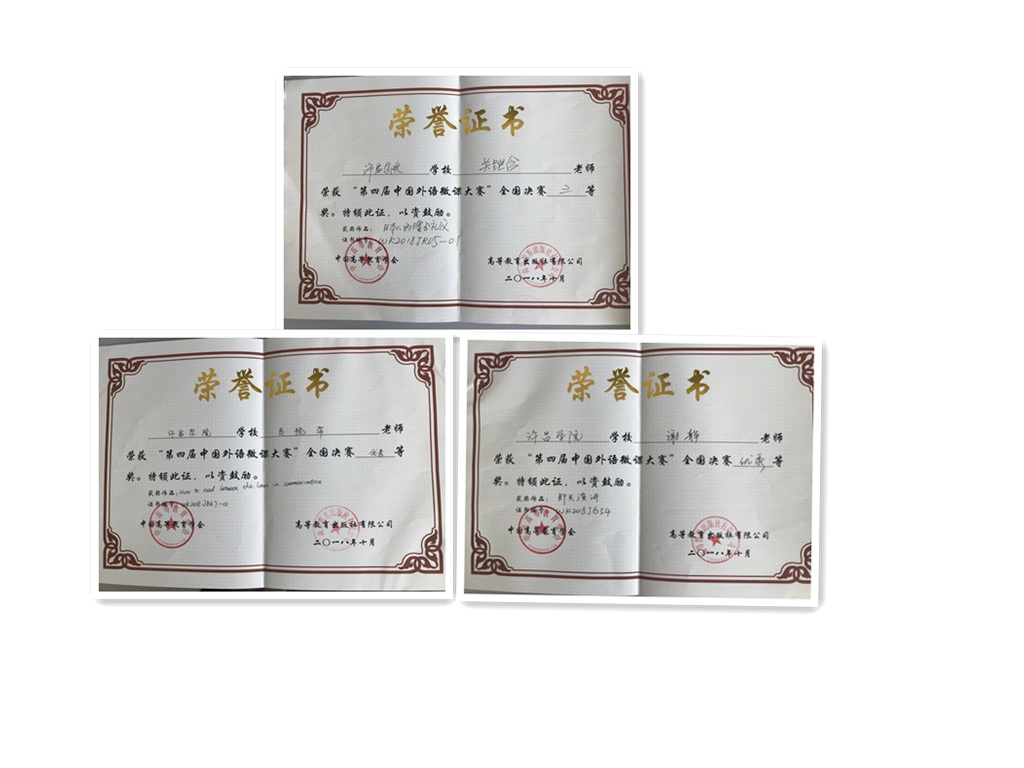 经过初赛和复赛的层层选拔和激烈角逐,关铠含、张方、周晓冰老师的作品《日本人的赠答礼仪》、员艳萍老师的作品《How to read between the lines in communication》,谢静老师的作品《即兴演讲 Impromptu Speech》获得河南省赛区一等奖进入全国总决赛。老师们的微课作品从选题到课程设计,从教学理念的渗透到教学基本功展示,从视频呈现设计到视频模态动画的选择,从教案编写到课后作业的处理等多个环节都得到了专家评委的一致认可和好评,最终,关铠含老师团队获得小语种组三等奖、员艳萍老师、谢静老师获得本科英语组优秀奖。