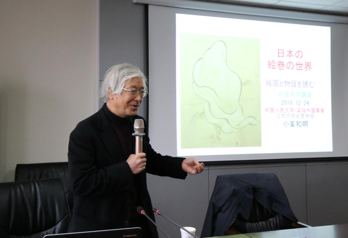 12月24日下午,应外国语学院邀请,中国人民大学高端外国专家小峯和明教授莅临我校讲学,作了一场题为“品读日本“绘卷”世界”的报告。外国语学院日语系90余名师生聆听了本次讲座。