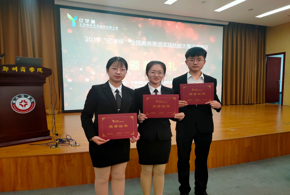 为推进我院商务英语专业建设和教学改革,进一步提高商务英语专业人才培养质量,2019年11月8日至9日,我院商务英语专业高超、赵洋、王莉莉三名参加郑州商学院承办的“2019年‘亿学杯’全国商务英语实践技能大赛河南赛区三等奖,高现伟、李莹老师荣获优秀指导教师。