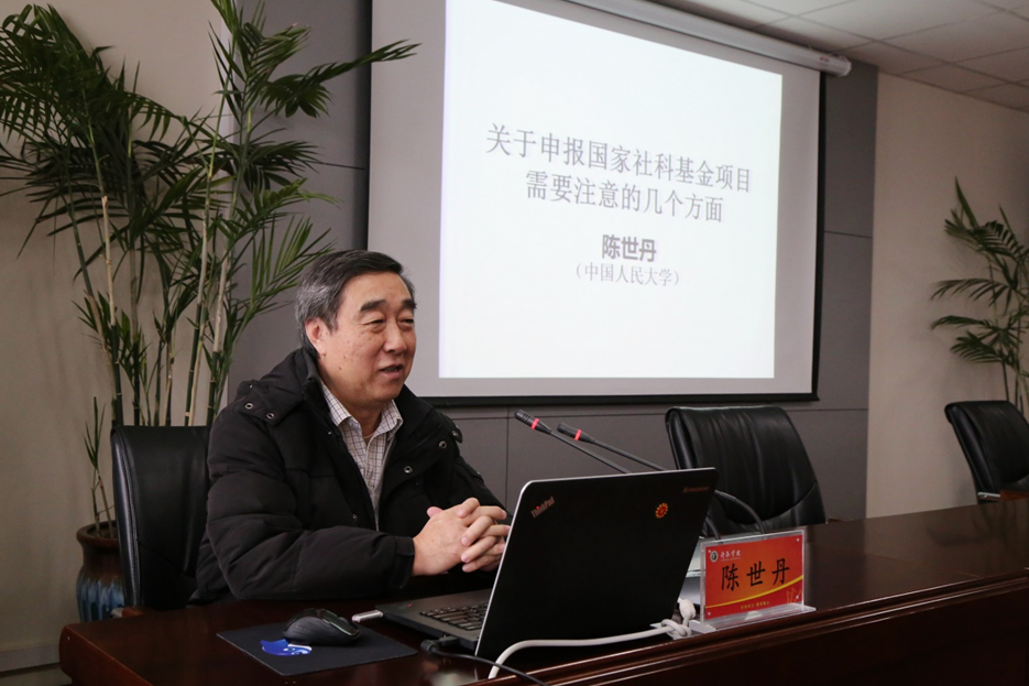 2020年1月7日上午10:00—12:00,中国人民大学博士生导师陈世丹教授应邀来我校讲学,作了“国家社科项目申报应注意的几个方面”的精彩讲座。本次讲座由外国语学院副院长刘立胜教授主持,外国语学院80多名教师参加。
