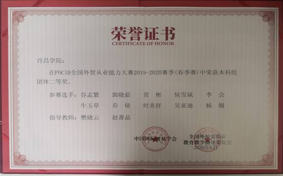 2020年6月4日上午比赛开始,经过长达15天的激烈比赛,6月18日第九届POCIB全国大学生外贸从业能力大赛成绩揭晓,我院商务英语系17级两个参赛团队,分别获得全国团体二等奖和全国团体三等奖。候雪斌同学获得个人二等奖,贺彬、李会、时炎祥、郭晓茹、张雯燕、李晴、薛瑞雯7名同学获得个人三等奖。樊晓云、赵菁晶获得指导老师二等奖,高现伟、付一凡老师获得指导老师三等奖。