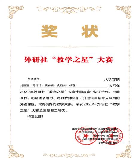 2020年外研社“教学之星”大赛全国复赛落下帷幕,本次大赛的赛题为:“语言与育人融合的外语课程与教学设计”。我院以刘丽丽为代表的教师团队通过创新的教学设计方案和精彩的授课视频,获得全国复赛二等奖。