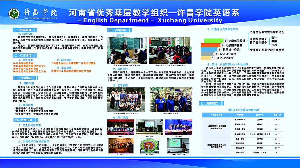 英语系2017年获批“河南省高校优秀基层教学组织”,2019年顺利通过教育厅验收。在本次优秀基层教学组织建设成果征集工作中,英语系认真梳理了在教学组织、专业建设、课程建设、实践教学、教学研究与改革、教师教学发展等方面的建设成效和改革经验,力争全面总结、突出亮点。