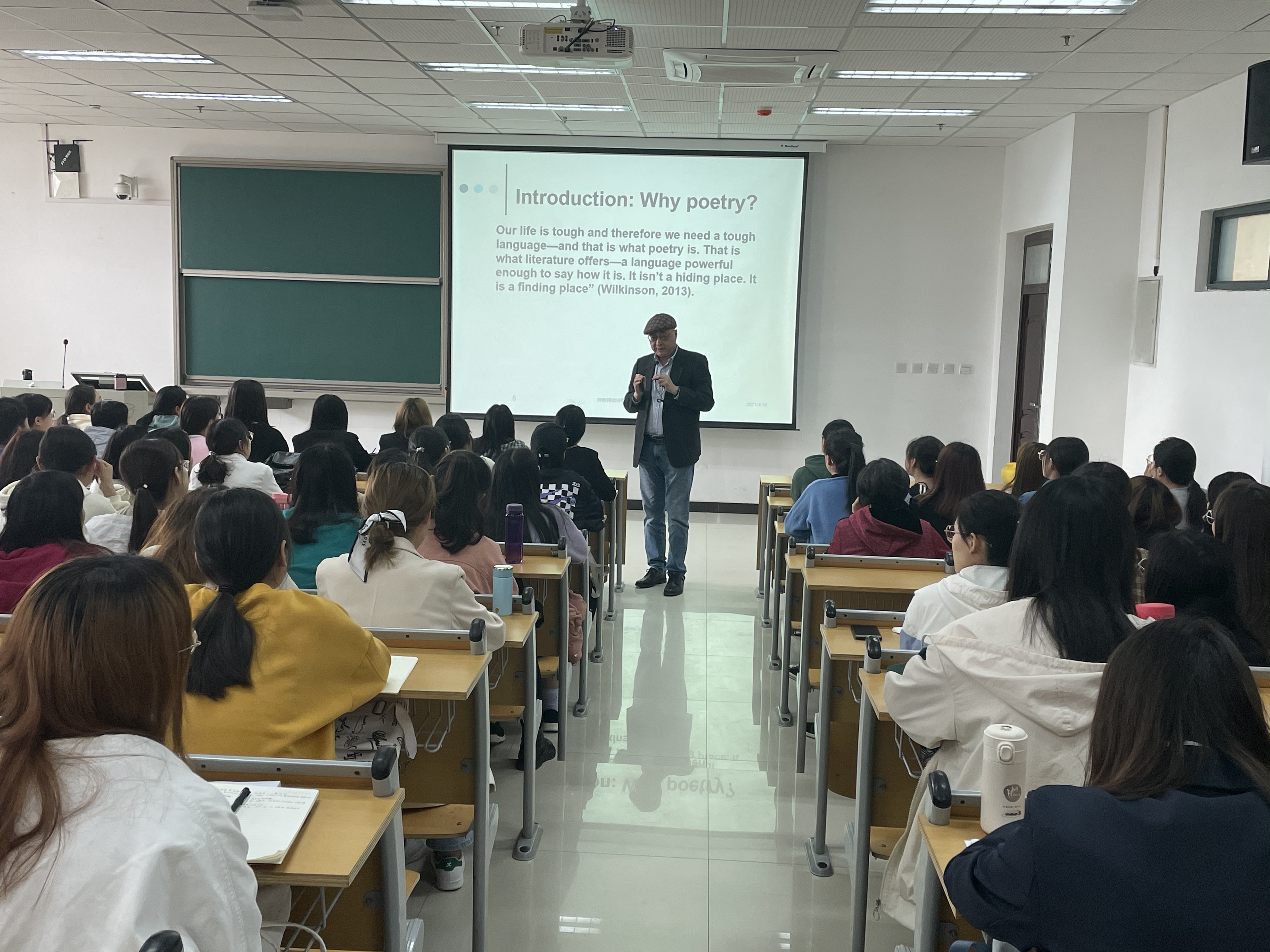 16日上午,郑新民教授在文科综合楼E418室为全院师生200余人作了题为《诗歌朗诵与英语学习》的讲座。他以莎士比亚的十四行诗Sonnet 18为例,从其节奏、音步类型(抑扬格、扬抑格、抑抑扬格、扬抑抑格)、诗行、押韵等方面分析本诗的特征,并具体讲解诗歌朗诵的技巧,包括读正语音、注意语调、把握节奏、掌握语速及大声朗读等。他指出诗歌朗诵是英语学习的一种重要综合训练方法,有利于提高英语口语水平及诗歌欣赏能力。另外,他就学生在学习中遇到的问题做了详细解答,并提出自己宝贵的建议,令与会师生受益匪浅。