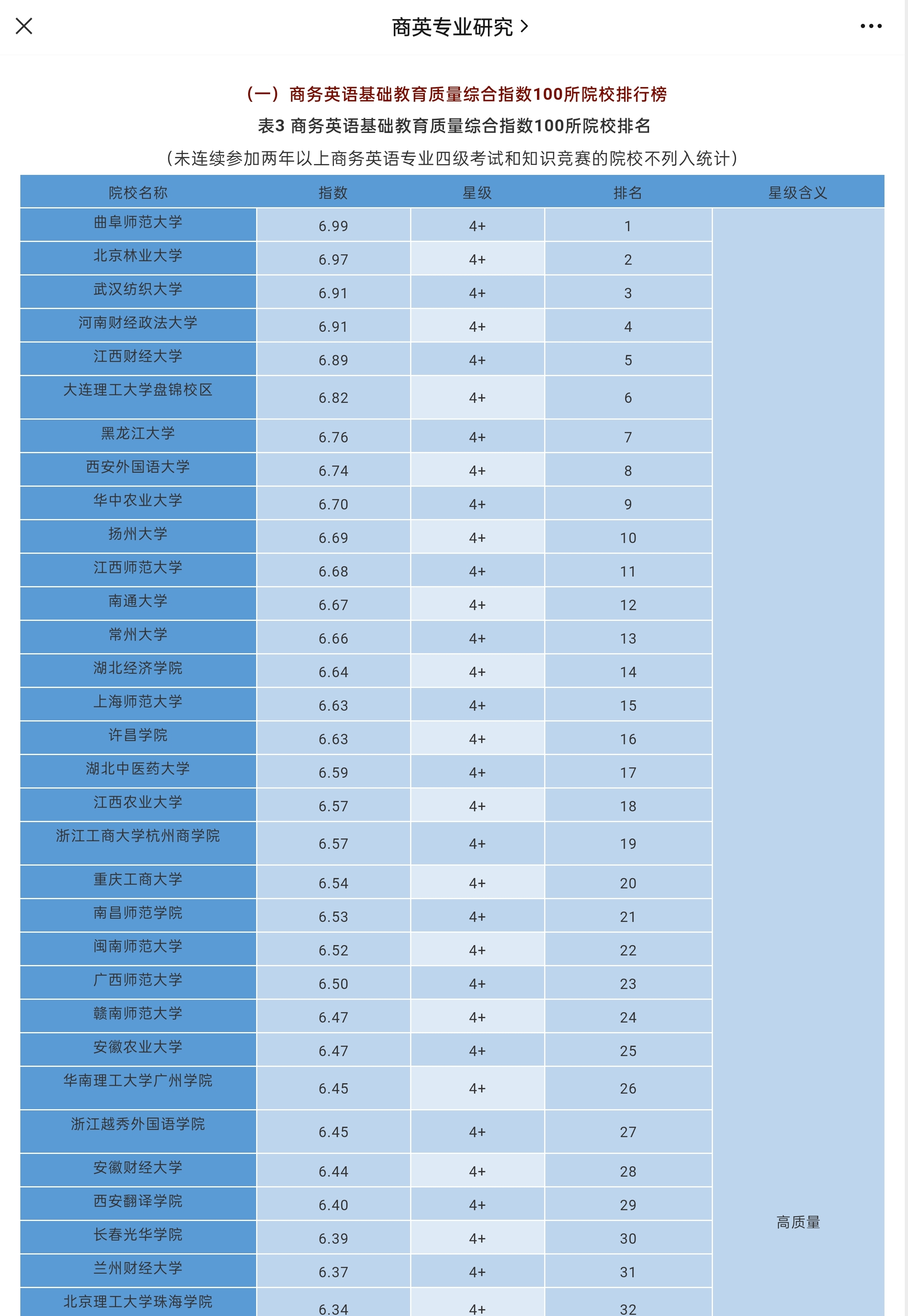 2021年12月26日上午,国家商务英语专业工作委员会年会发布《全国商务英语基础教育质量调查报告》,对全国1140余所高校商务英语专业基础教育质量进行排名,我校外国语学院商务英语专业名列前茅,取得综合指数排名第16位的优异成绩。