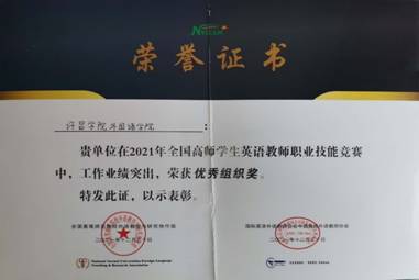 日前,由全国高等师范院校外语教学与研究协作组和国家基础教育实验中心主办的2021年全国高师学生英语教师职业技能竞赛决赛落下帷幕,我院参赛选手在竞赛中取得佳绩,荣获二级一等奖2人,二等奖1人,三等奖3人,优胜奖6人;荣获一级一等奖2名,二等奖2名,三等奖3名,优胜奖6名。许昌学院外语学院获大赛优秀组织奖,张艳玲、谢静、卢书娟、刘丹丹等7位教师获得本届大赛优秀辅导奖。