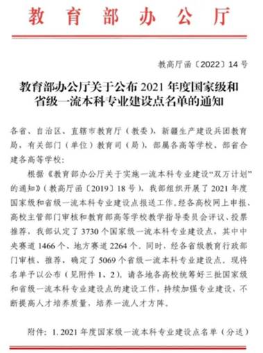 近日,教育部办公厅发布了《关于公布2021年度国家级和省级一流本科专业建设点名单的通知》(教高厅函〔2022〕14号),外国语学院英语专业获批国家级一流本科专业建设点,实现了我院专业建设的新突破。