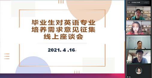 2021年4月16日上午,英语系通过在线会议的方式召开了毕业生对英语专业培养需求的意见征集座谈会。英语系教师代表和英语专业2017届、2018届毕业生代表就英语专业师范生培养需求进行了认真研讨。
