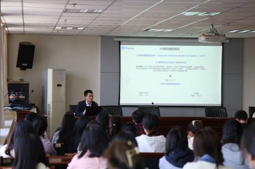 随后,在专题报告环节,张井先生以“机器翻译与译后编辑技术的发展与应用”为题详细阐述了机器翻译的发展历程,分析了技术背后的巨大术语库和语料库问题,展望了机器翻译应用平台快速更迭的趋势,呼吁翻译专业学生主动接受新科技的到来。结合我校翻译专业学生的实际情况,张先生有针对性地介绍了YiCAT机辅翻译软件、相关学科竞赛的流程和赛事特点、翻译专业学生就业方向和能力需求。在讲座中,张先生旁征博引,娓娓道来,与会师生纷纷表示获益匪浅,对行业前沿信息有了进一步的了解。