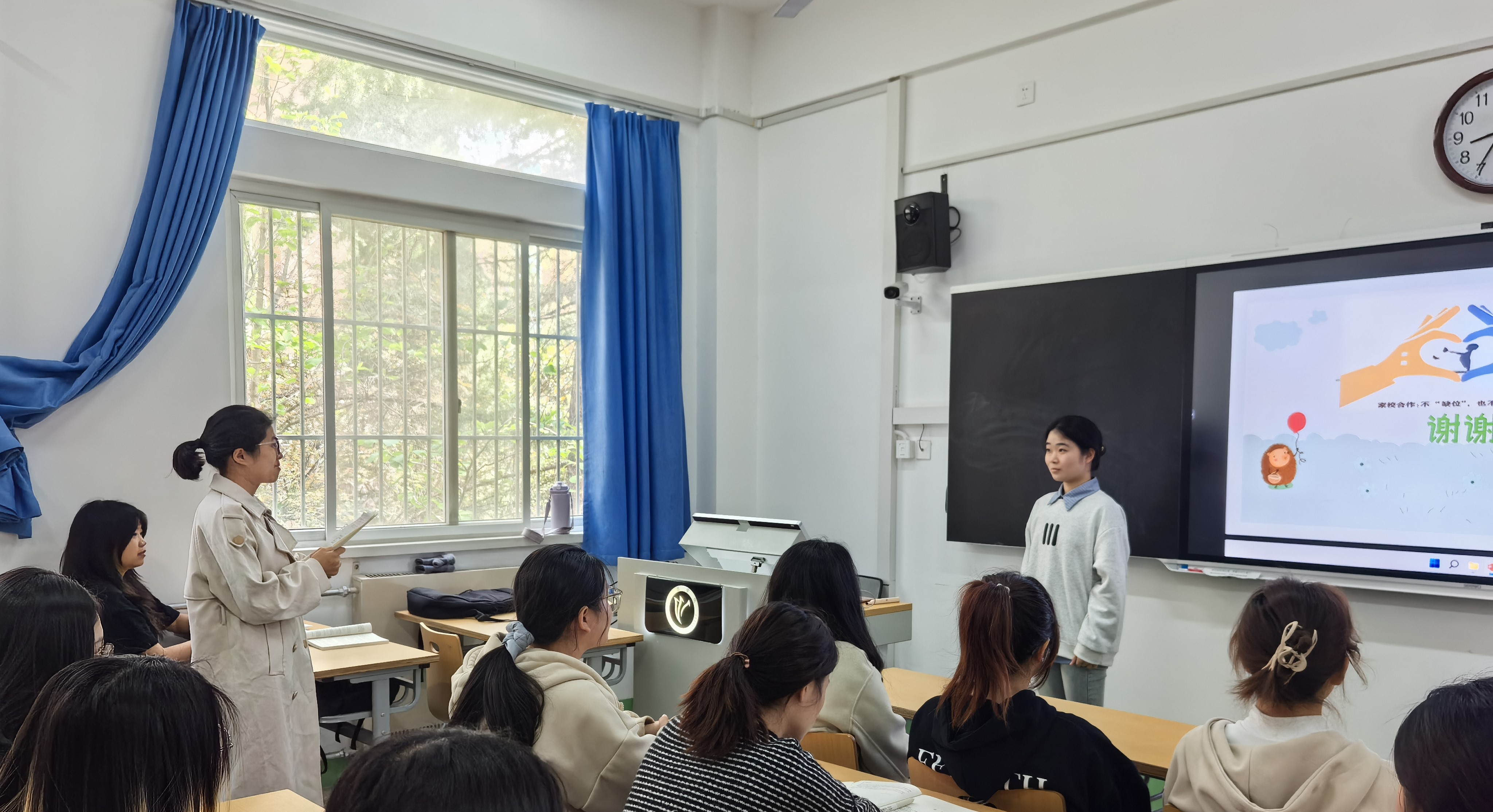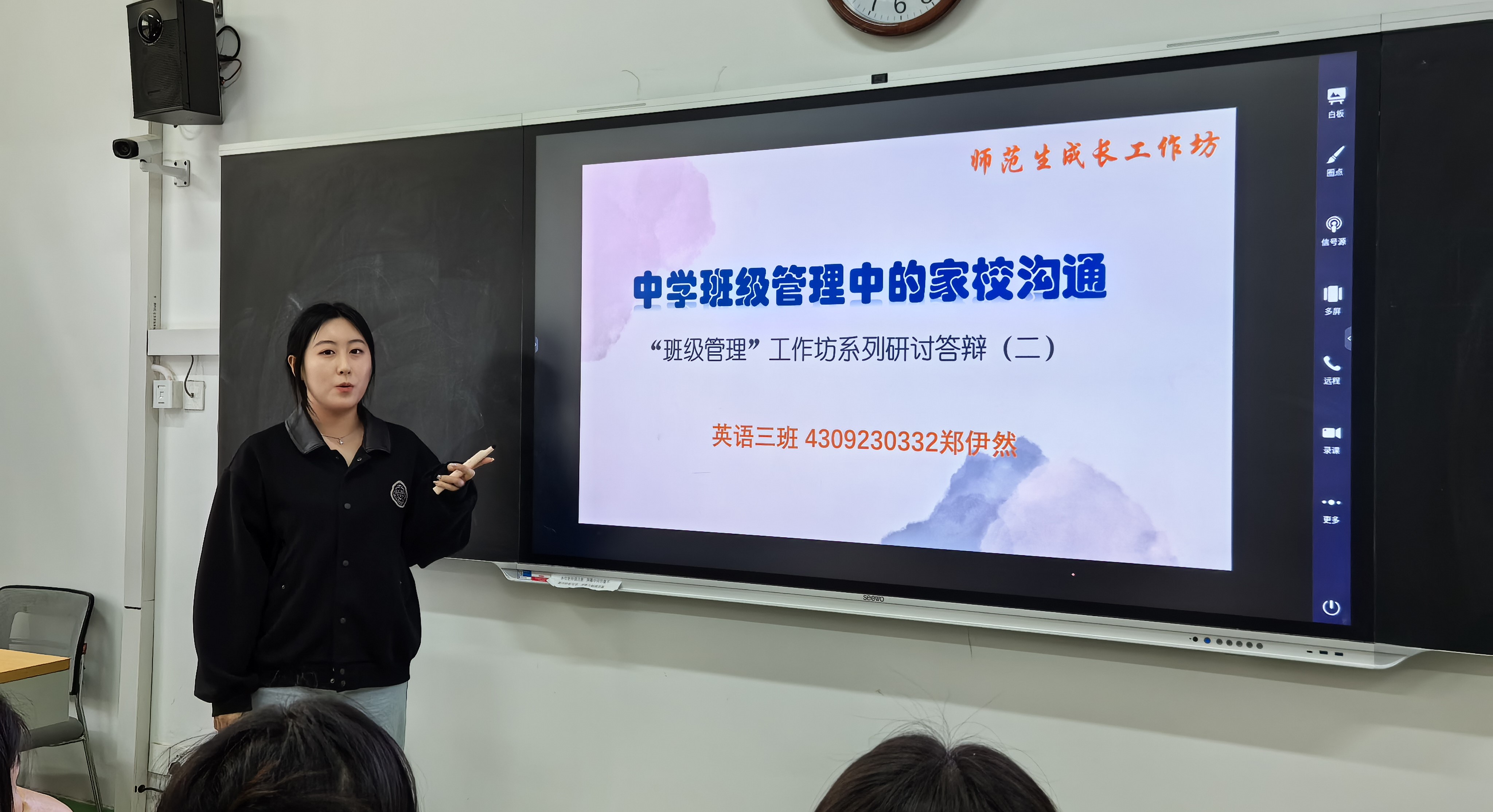 本轮研讨答辩活动再次对师范生综合素质的提升起到了推动作用:工作坊学员对中学班级管理相关知识进行了梳理,在思辨过程中进一步加强了对家校沟通的关注,为未来走上教育者岗位奠定了基础。(图片提供:李茜)