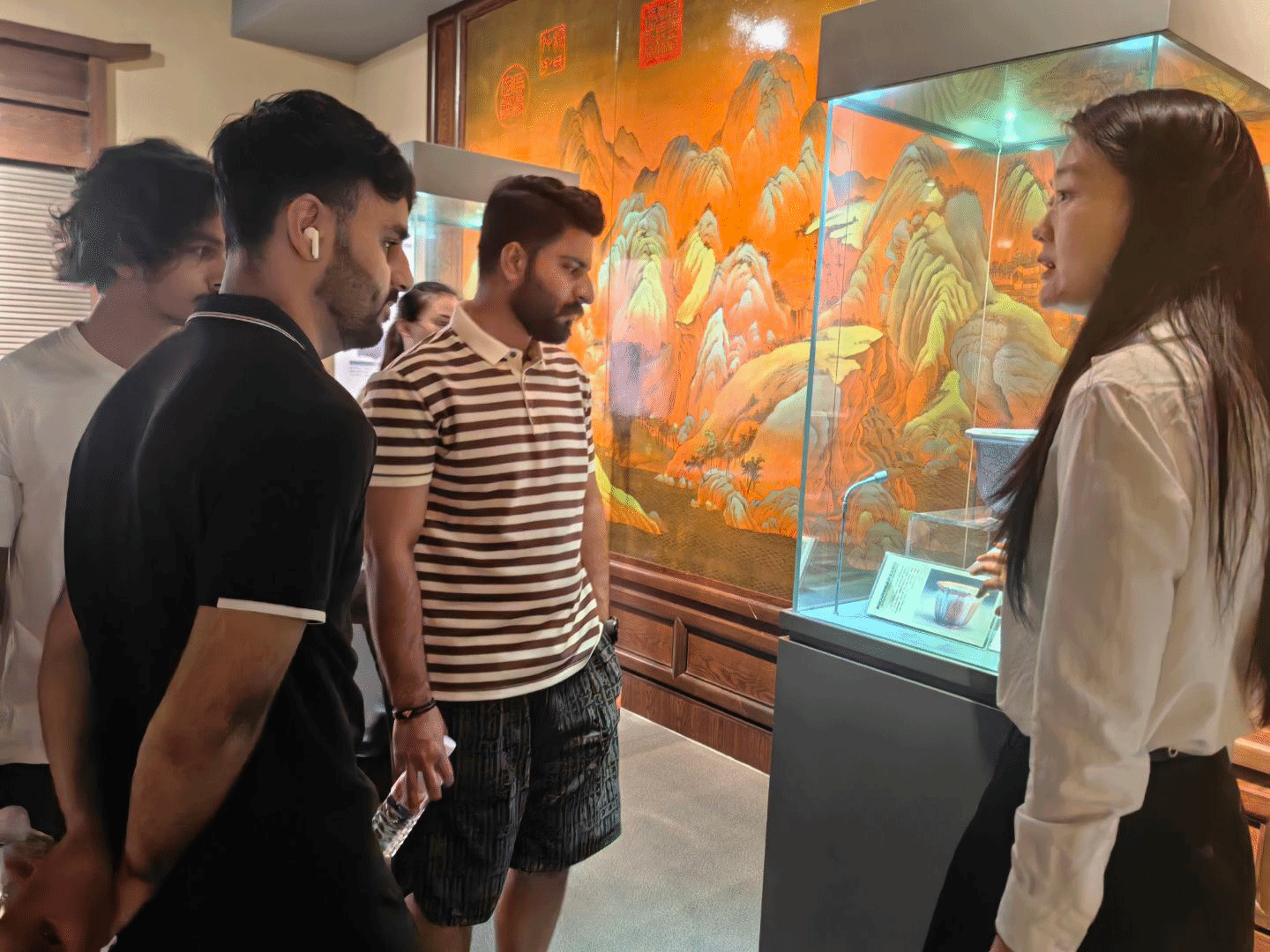 活动伊始,留学生们在博物馆专业英语讲解员的引导下,深入参观了馆内陈列。从“大禹之州”的庄重历史场景,到“考古寻夏·夏都何在——禹州瓦店遗址考古展”揭示的中原文明源头,再到琳琅满目、色彩绚烂的历代钧瓷珍品,留学生们系统了解了钧瓷深厚的历史文化底蕴、独特的工艺发展历程以及其在中国陶瓷史上的重要地位。讲解员生动地阐释了钧瓷“入窑一色,出窑万彩”的神奇窑变奥秘,以及其作为宋代五大名窑之一的艺术成就,令留学生们惊叹不已。