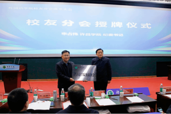 刘立胜教授首先介绍了校友分会筹备情况并宣读校友分会理事会组成候选人名单,同时表决通过了理事会组成人员名单。朱国君主任宣读了《关于同意成立外国语学院校友分会的批复》。许昌学院申占伟书记为外国语学院校友分会授牌,正式标志着外院校友分会的正式成立。
