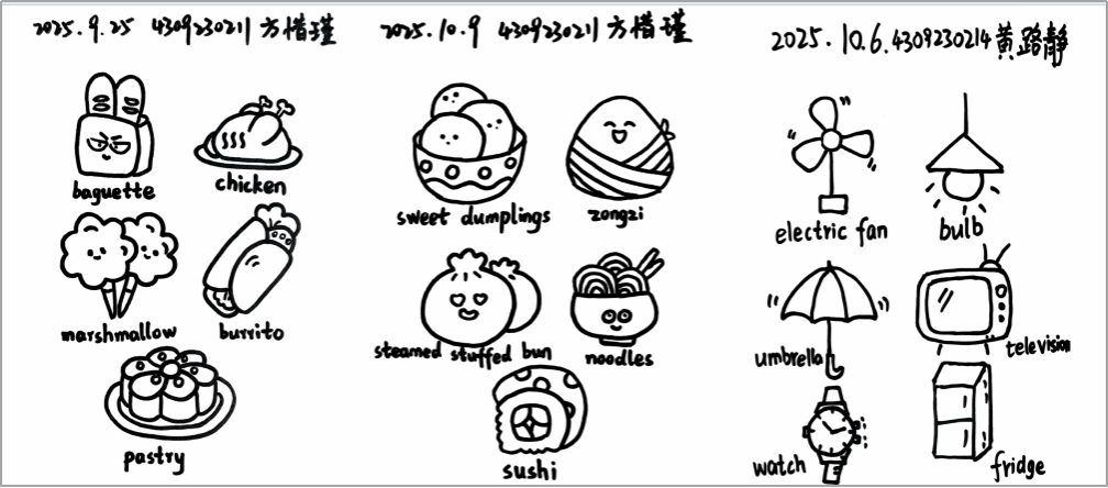本训练项目旨在帮助学生掌握教学简笔画的基本技巧与方法,能够依据教学内容迅速且精准地绘制相应简笔画,切实提高课堂教学的趣味性与实效性。工作坊为23级英语师范生每个班级都配备了一名指导教师。指导教师熟悉中小学英语教材内容,在教学过程中能结合学生实际情况,引导学生掌握绘制技巧,将简笔画与英语教学巧妙融合。训练项目要求每位学生每周完成一组(2 至 4 幅)教学简笔画作品。作品内容学生可自主选择,但必须紧密贴合英语教学实际需求。学生可以从英语单词、短语、句子、语法知识、故事场景等多个方面选取创作主题,借助简笔画把抽象的英语知识直观地呈现出来。比如,在学习动物单词时,学生可以绘制各种憨态可掬的动物简笔画;在学习英语语法时,能用简笔画清晰解释语法规则。学生按时将完成的作品上交指导教师后,指导教师每两周依据每位学生作品的完成情况进行打分,评分标准涵盖简笔画的准确性、简洁性、生动性以及与教学内容的契合度等维度。准确性要求简笔画能精准表达所代表的英语知识;简洁性强调用简洁线条勾勒出物体主要特征;生动性注重简笔画的形象与趣味性,以吸引学生注意力;与教学内容的契合度则要求简笔画紧密围绕教学主题,为教学服务。