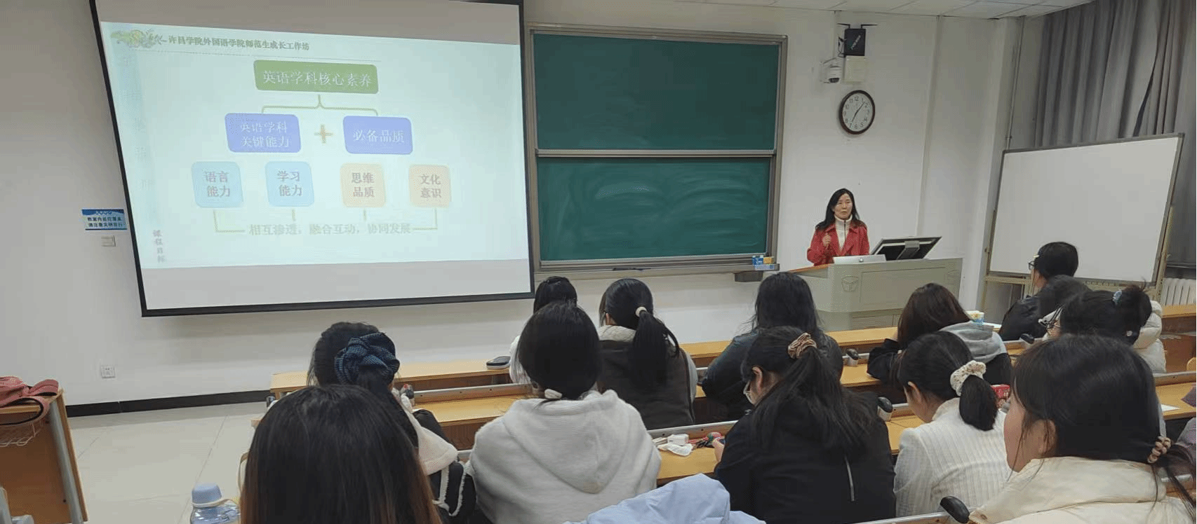 为助力师范生深化对双新背景下英语教学的理解,提升听评课专业能力,2025年10月11日晚7点,许昌学院外国语学院课例精修工作坊特邀请许昌学院附属中学李晓华老师在文科综合楼E309教室开展了《如何进行听评课》的专题分享。2022级全体学员,约200名师生参与本次活动。