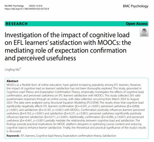 近日,我院马玲玲老师以独立作者身份在国际期刊BMC Psychology发表题为“Investigation of the impact of cognitive load on EFL learners’ satisfaction with MOOCs: the mediating role of expectation confirmation and perceived usefulness”的学术论文,该期刊同时被 SSCI(3 区)与 JCR(1 区)收录,研究成果具有较高的国际学术影响力。