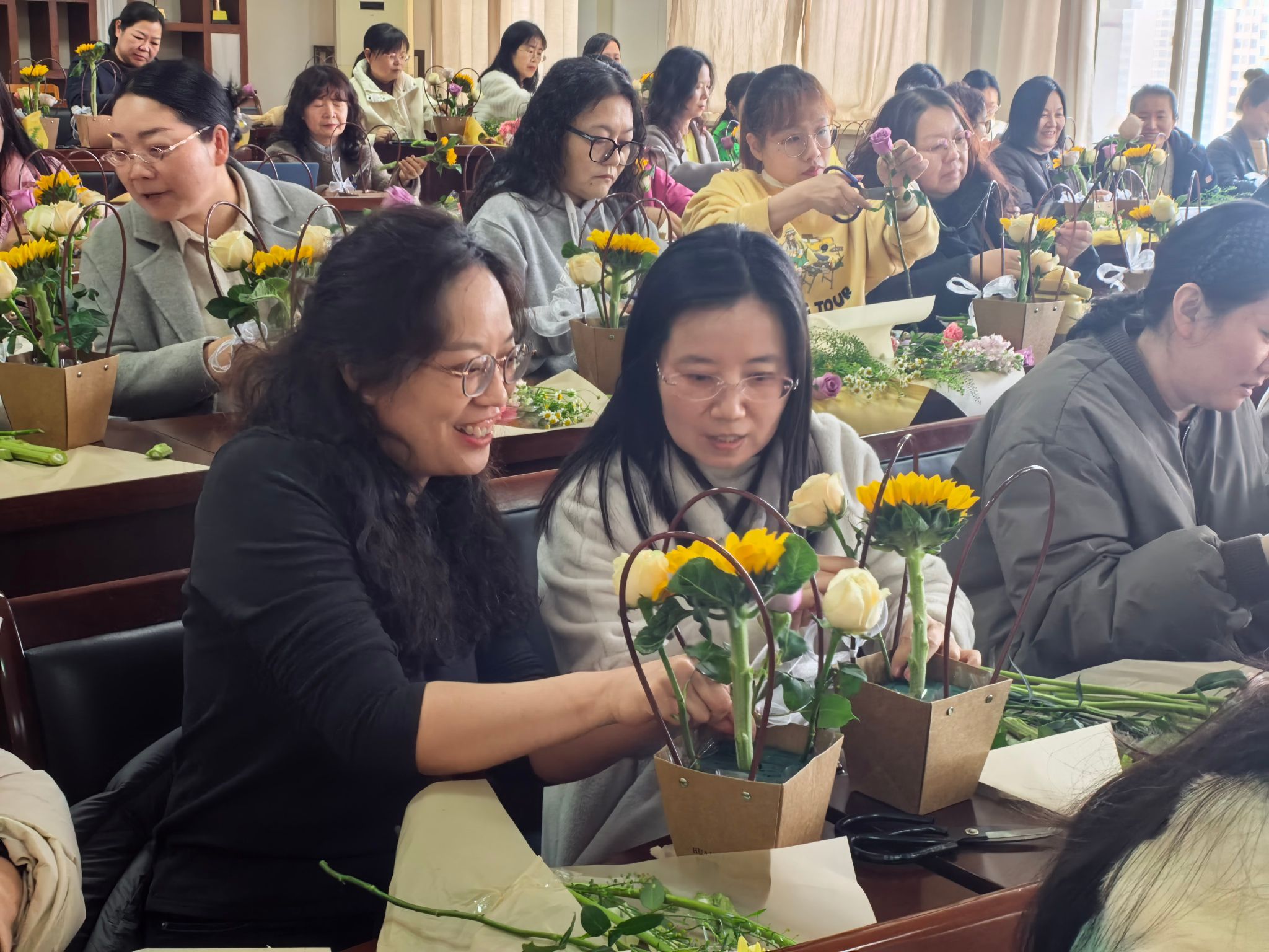 在花艺师的指导下,平日里辛勤耕耘在三尺讲台和行政一线的女教工们化身成了“花艺师”。她们充分发挥想象力和创造力,用心挑选花材,精心修剪枝叶,将原本普通的花草,通过巧妙的构思和灵巧的双手,搭配成了一盆盆错落有致、生机盎然、独具匠心的插花作品。活动现场欢声笑语不断,大家相互交流插花心得,彼此欣赏作品,用相机记录下这美好的瞬间。