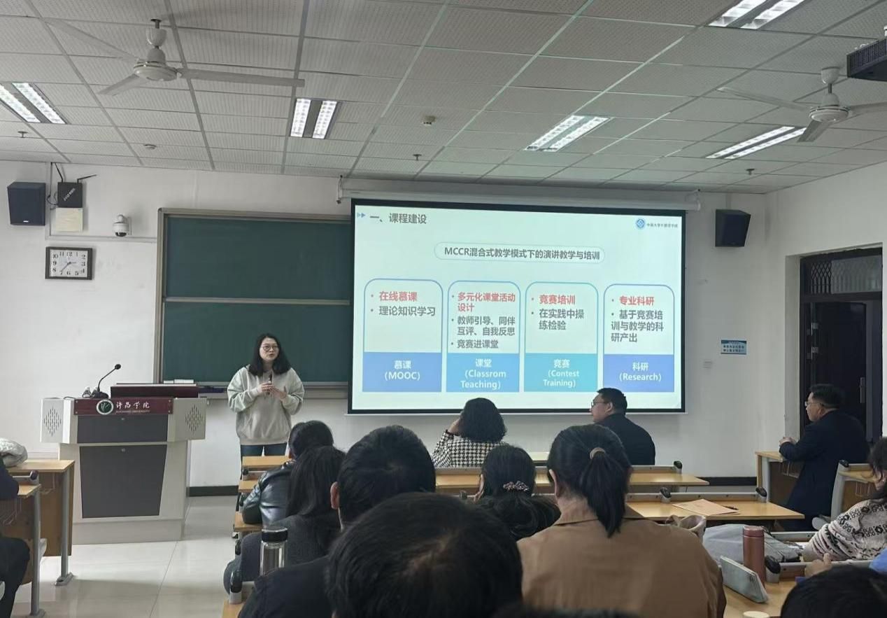 讲座中,张春敏教授以“教赛研融合相长,赋能人才培养——以中南大学演讲教学教赛研模式为例”为主题,以中南大学演讲教学实践为蓝本,从“以课为本、以赛促教、科研反哺、相长共赢”四大维度,系统阐释了教赛研融合的育人模式。她详细介绍了《英语演讲技巧与实训》课程的数字化探索与 AI 赋能实践,分享了将竞赛元素融入课堂设计、建立竞赛梯队培养机制的实操策略,还讲解了从教学实践中凝练学术问题、以科研成果反哺教学的闭环路径,同时结合自身经验,探讨了教赛研融合背景下教师专业发展的成长方向。