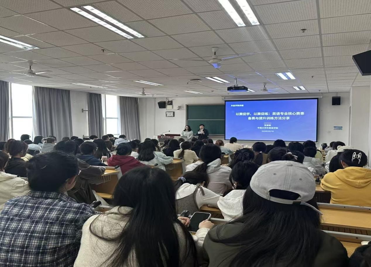 为助力英语专业学生提升赛事备赛能力,以赛促学、以赛促练夯实专业核心素养,2026年3月27日下午,我院特邀中南大学外国语学院张春敏教授,于E-406教室作题为“以赛促学、以赛促练:英语专业核心赛事备赛与提升训练方法分享”的专题讲座。讲座由我院副院长曾尔奇教授主持,约100名学生到场聆听学习。