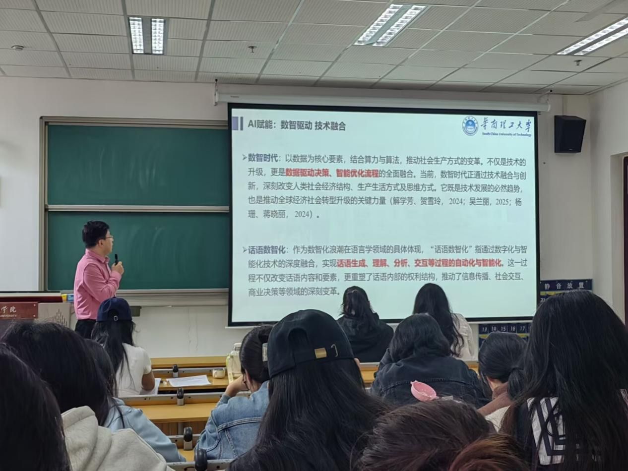 讲座中,武教授结合华南理工大学的实践经验,深入阐释“科教融合、智传并举”“数智驱动、技术融合”的核心要义,并着重强调“创新驱动、教研相长”“精神指引、实践导向”的实践路径。他以鲜活案例为引,深刻剖析了用外语讲好中国故事离不开扎实的调查研究,同时点明AI赋能在中华文化传播中的重要价值,鼓励学生以开放的心态,立足实践根基,用英语讲好中国故事。