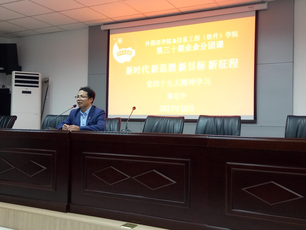 10月24日,在文综楼1917会议室,陈化宇老师做了“党的十九大精神学习”专题团课,详细向大家阐述十九大中的关键名词,我院入党积极分子参加了此次活动。