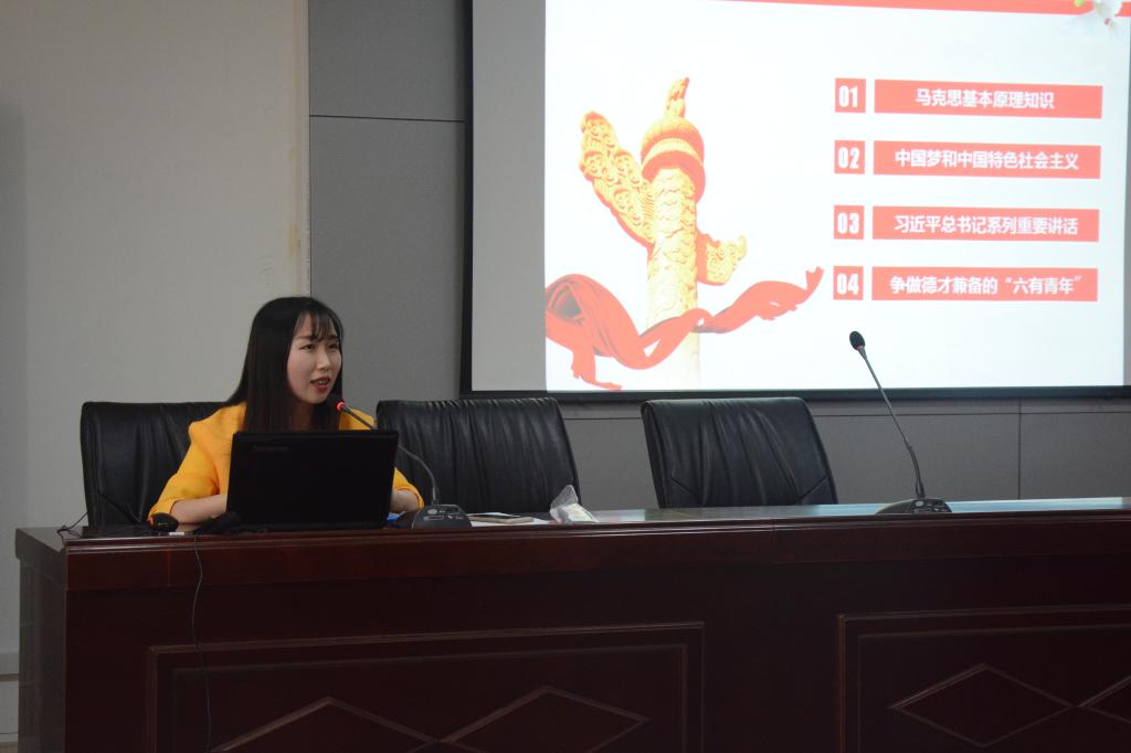 牛怡晨老师主要从马克思主义的基本理论、中国梦和中国特色社会、习近平总书记系列重要讲话、争做德才兼备的六好青年四个方面展开。要求学生积极培育和践行社会主义核心价值观,认真学习马克思主义的基本理论,遵守纪律,提高自身组织性、觉悟性、纪律性,让学生在成长过程中得到导向性帮助。然后牛老师朗读了习近平总书记的重要讲话,让学生们认真听讲,认真思考,然后从中得到自己的理解,形成自己的看法,并朗读了关于爱国主义的诗歌。针对大学生入党问题,牛老师提出入党动机虽多种多样,但大学生应追求真理性,提高个人思想觉悟,把自己的事业和党的事业相结合,并为之努力奋斗。