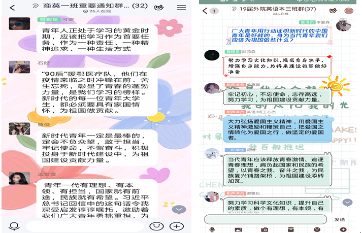 为深入学习贯彻习近平总书记给北京大学援鄂医疗队全体“90后”党员回信精神,积极响应省委高校工委、省教育厅的工作部署,2020年5月8日下午,外国语学院组织全院师生以集体在线学习讨论的形式开展了向焦作市武陟县中水寨村马明杰等10名大学生优秀群体学习活动,全院4个年级共计1070名学生参与了学习活动。