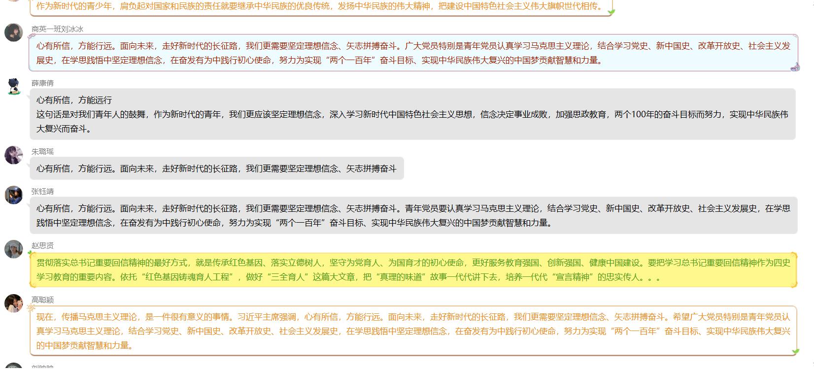 随后,各团支部进行了集中学习和网络讨论。各支部党员、团员学生纷纷表示深切体会到总书记对青年一代坚定理想信念、校准人生航向的谆谆教导,会不断坚定理想信念,矢志拼搏奋斗,自觉成为担当民族复兴大任的时代新人。