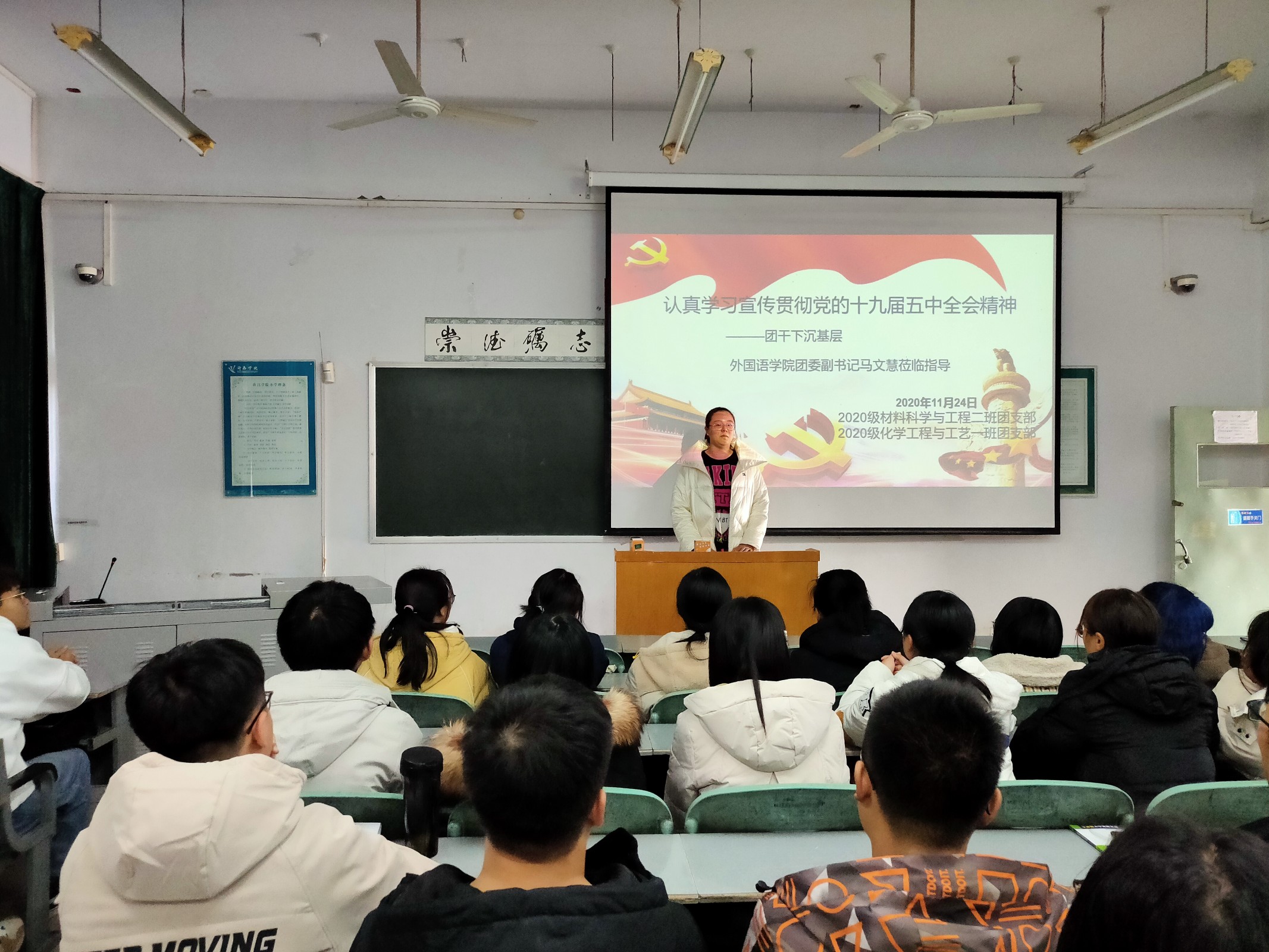 为认真贯彻学习党的十九届五中全会精神,加强共青团团干队伍建设,使团组织起到“带头靠前学,带动广泛学”的榜样模范作用,2020年11月24日外国语学院团委副书记马文慧为化工与材料学院“团干部下沉基层”的联点团支部2020级材料科学与工程二班团支部以及化学工程与工艺团支部的学生们在C-106教室举行了第二次“团干下沉基层”组织活动。此外,参加本次会议的还有外国语学院团委学生副书记刘博伟和化工与材料学院团委学生副书记李奉蔚。