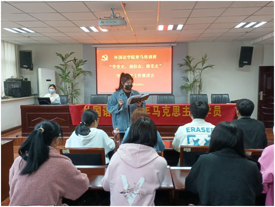 为了提高青年马克思主义学员的思想政治素质,加强青年学生骨干之间的交流合作,坚定跟党走中国特色社会主义道路的信念,外国语学院于2021年4月9日下午17点30在文综楼1917会议室召开了外国语学院青马培训班“学党史,强信念,跟党走”学习教育工作推进会。