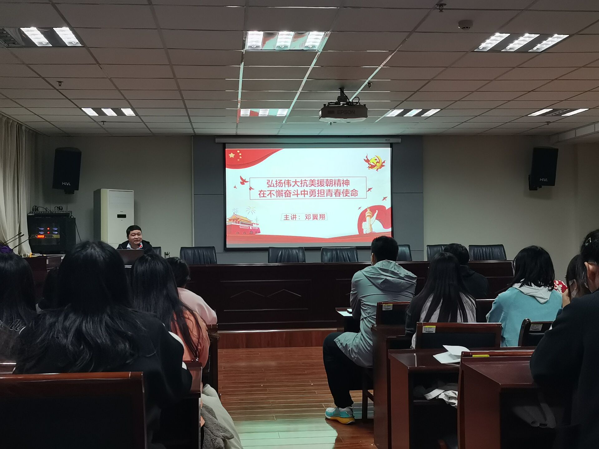 10月25日,邓翼翔老师以“扬抗美援朝精神—勇担青春使命”为主题开展培训,邓老师详细讲解了抗美援朝精神的丰富内涵。并强调,青年是中国共产党的生力军,是助手和后备军,我们愿从先辈们的手中接过这把时代接力棒,担负起祖国复兴的重任。