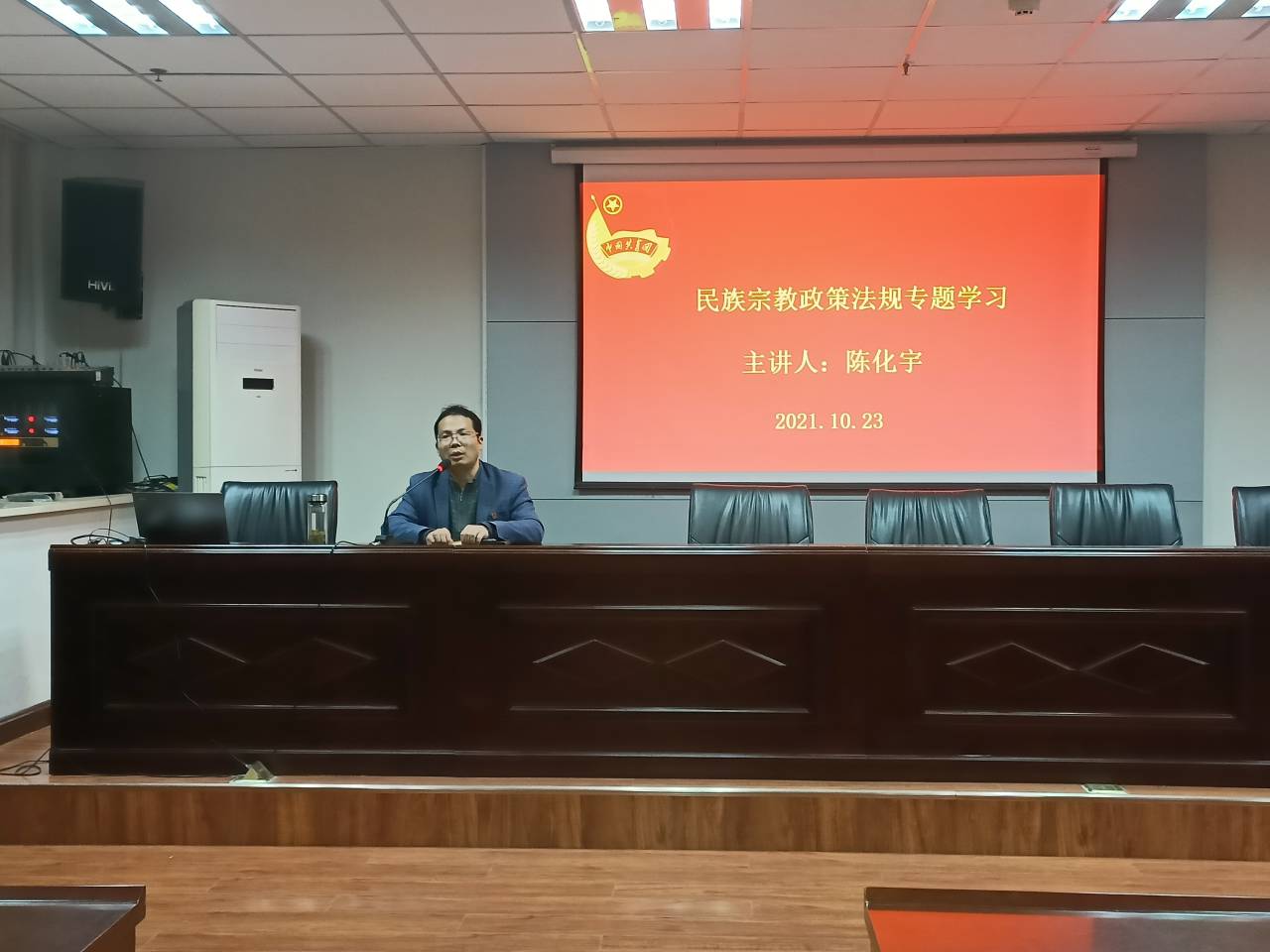 10月23日,陈化宇老师以“民族宗教政策法规”为主题开展培训,陈老师讲述了防范敌对势力、防范宗教渗透、禁止校园传教;严禁非法聚集,坚持教育与信教相分离。并强调,作为青年学生,欲成大事,当立大志,新时代青年最大的志,就是为了中华民族伟大复兴而努力奋斗。