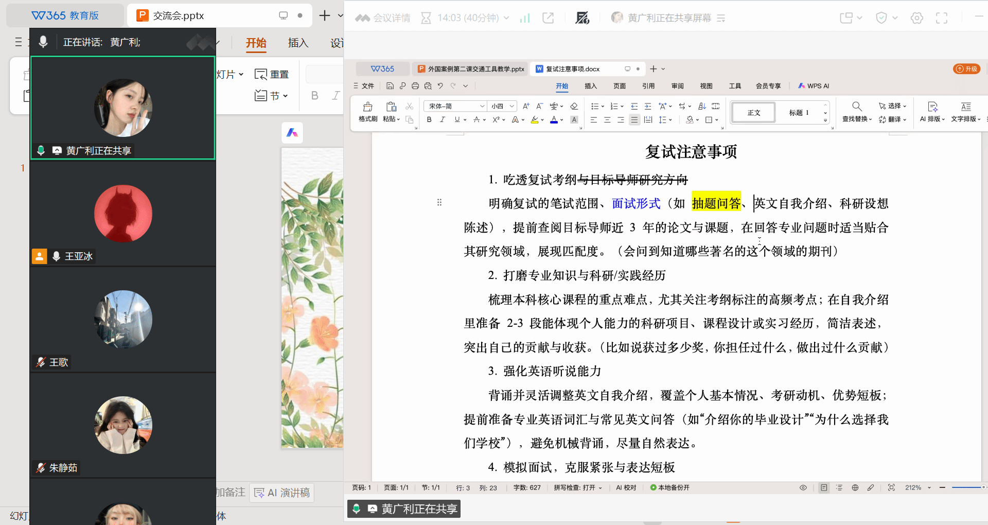 活动伊始,校友们结合自身经历与心得,毫无保留地剖析了复试关键要点。针对复试流程,她们详细介绍了材料准备、线上线下注意事项,提醒同学们提前熟悉规范,做好物资与心理双重准备,避免细节失误。专业课面试方面,结合专业方向,讲解了知识梳理重点、答题逻辑及思路构建方法,叮嘱大家夯实专业基础、梳理核心知识点、关注学科前沿动态,答题时条理清晰、逻辑严谨,展现专业优势与学术潜力。同时,还分享了面试礼仪、心态调整等实用技巧,帮助同学们展现良好风貌。