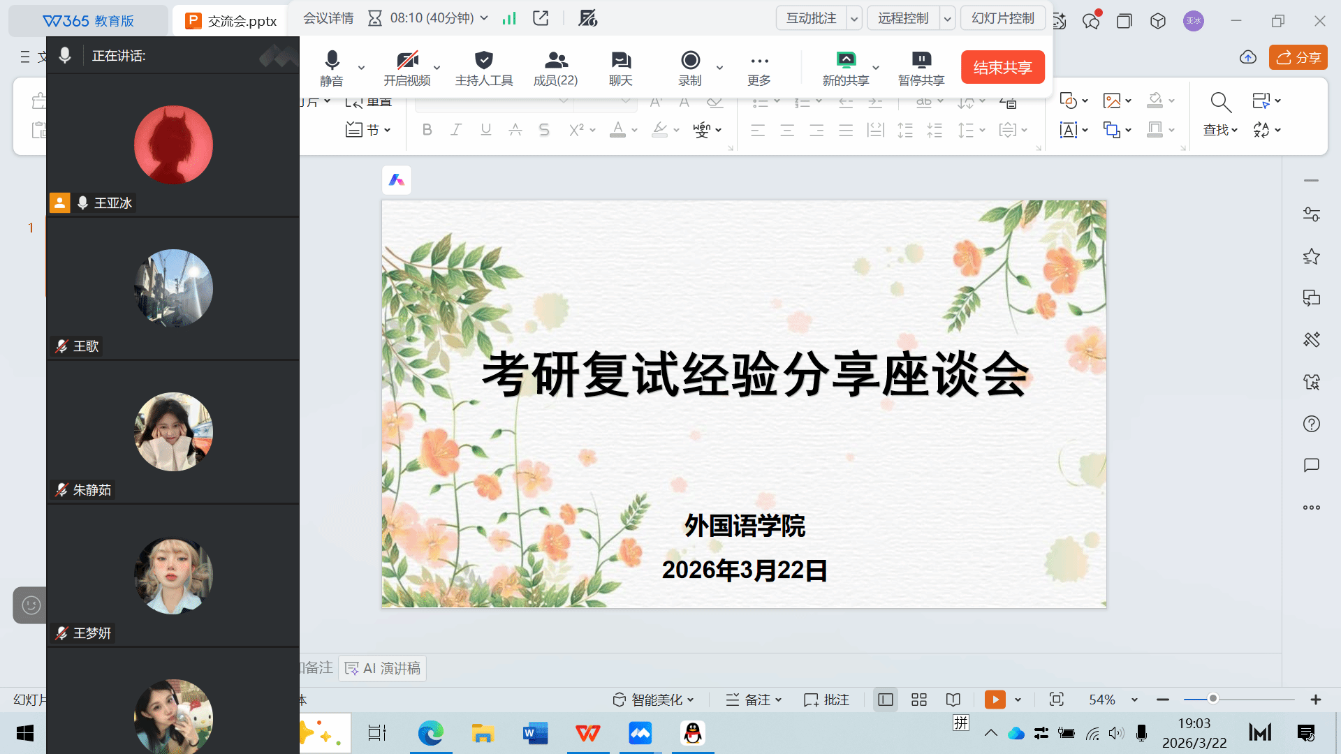 2026年3月22日,外国语学院举办考研复试经验分享座谈会,旨在帮助备战复试的学子明确备考方向、掌握复试技巧、缓解备考焦虑、攻克复试难点。活动邀请我院21级考研成功的优秀校友,围绕复试全流程、英语口语、专业课面试、调剂策略等核心内容分享经验。活动由22级辅导员王亚冰主持,学院复试备考学生积极参与。