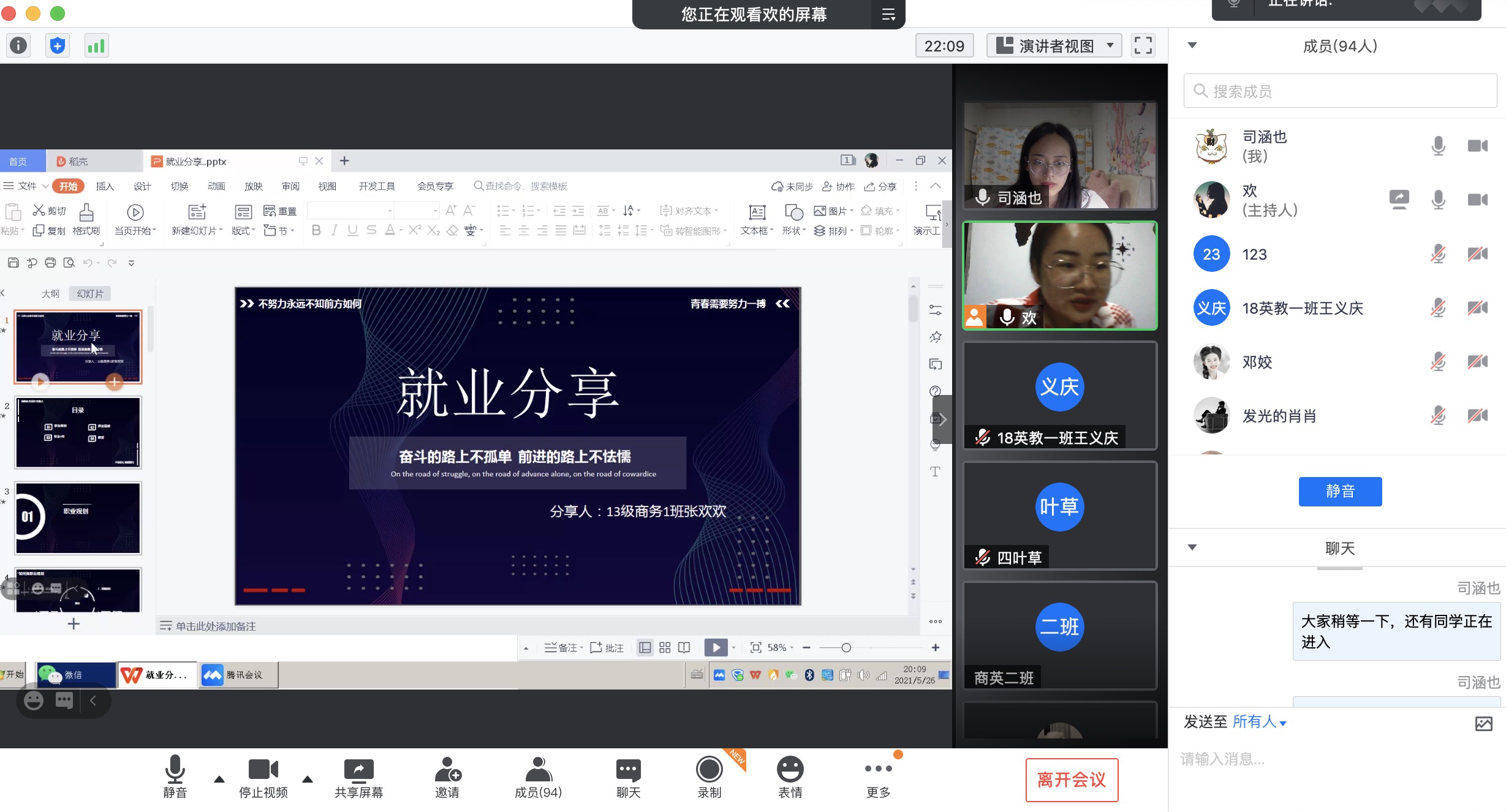2021年5月27日晚上7时,2017届优秀毕业生张欢欢通过腾讯视频为我院毕业生开展了就业分享交流会。张欢欢,2017年毕业于许昌学院,任职深圳亿柯医疗有限公司,东非区域经理。